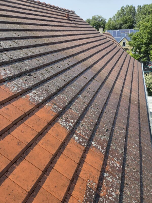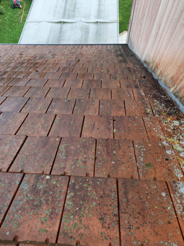 Avec le temps, la toiture était fortement encrassée par des mousses, des lichens et des salissures, ce qui pouvait, à long terme, fragiliser les tuiles.